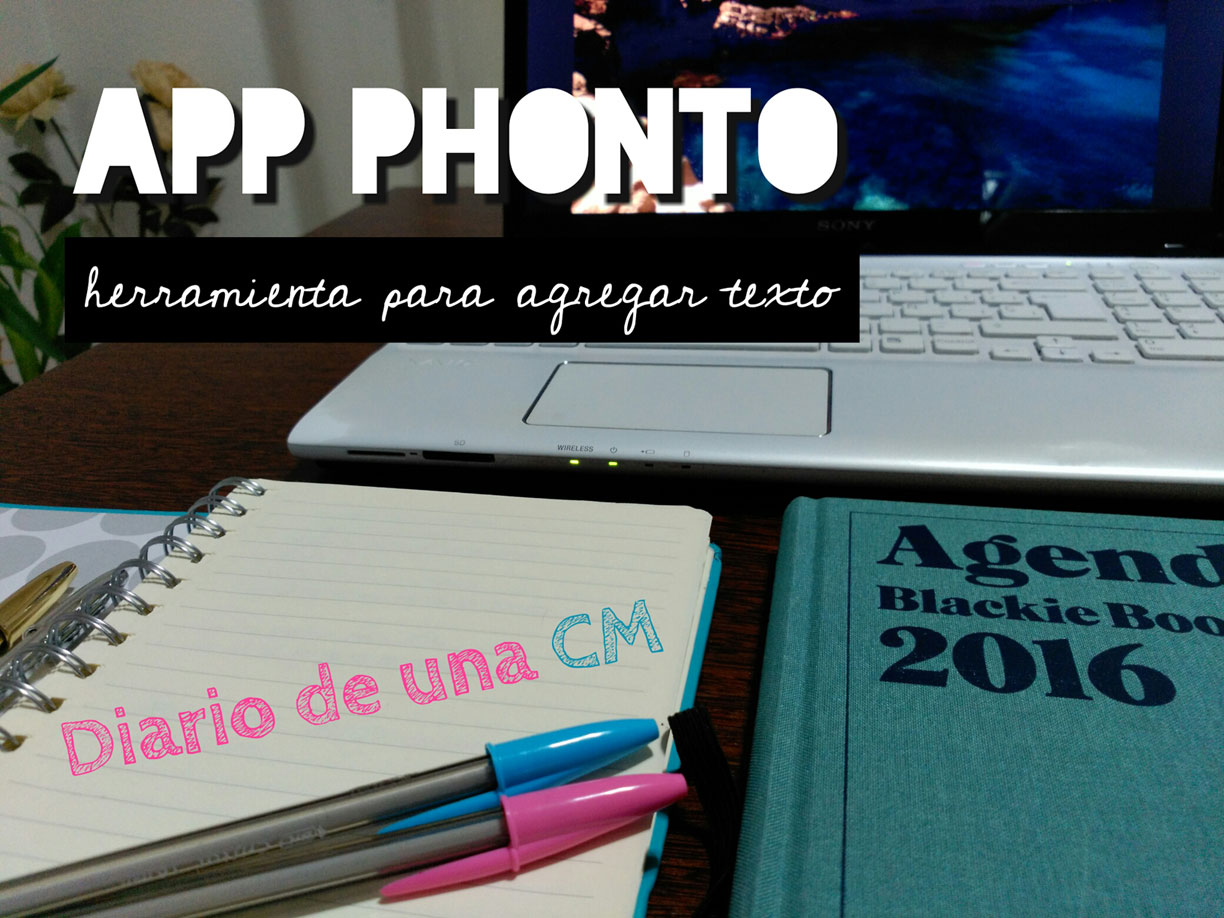En esta imagen se ha usado la opción «shadow» en «APP PHONTO», «background» en «herramienta para agregar texto», y «tilt» en «Diario de una CM». No tiene la posibilidad de combinar colores en un texto, así que «Diario de una CM» en verdad son 2 textos, «Diario de una» en color rosa y «CM»en color azul.